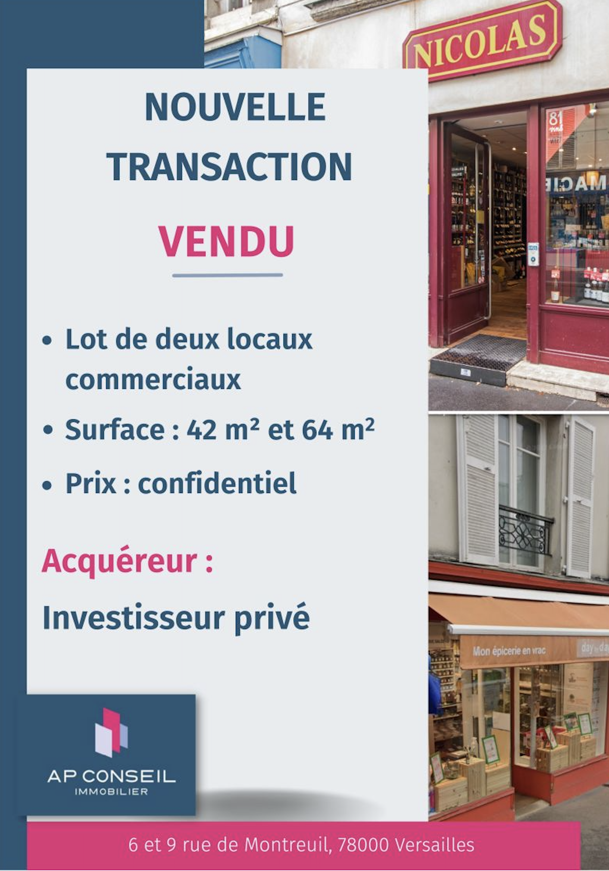 Nous avons vendu un lot de deux locaux commerciaux de 42 m2 et 64 m2 situés dans la ville de Versailles.
