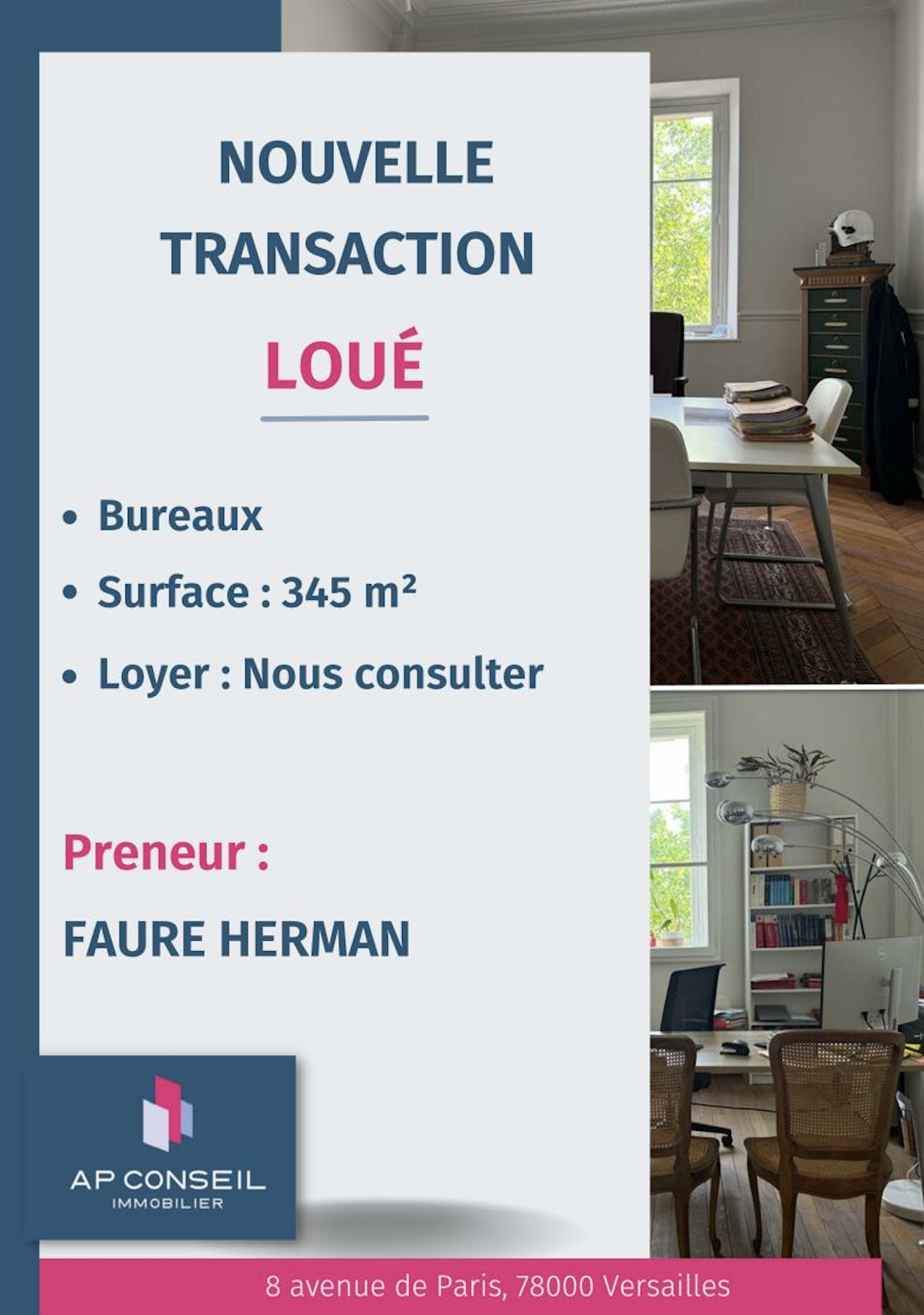 Nous avons loué des bureaux de 345 m2 situés dans la ville de Versailles.