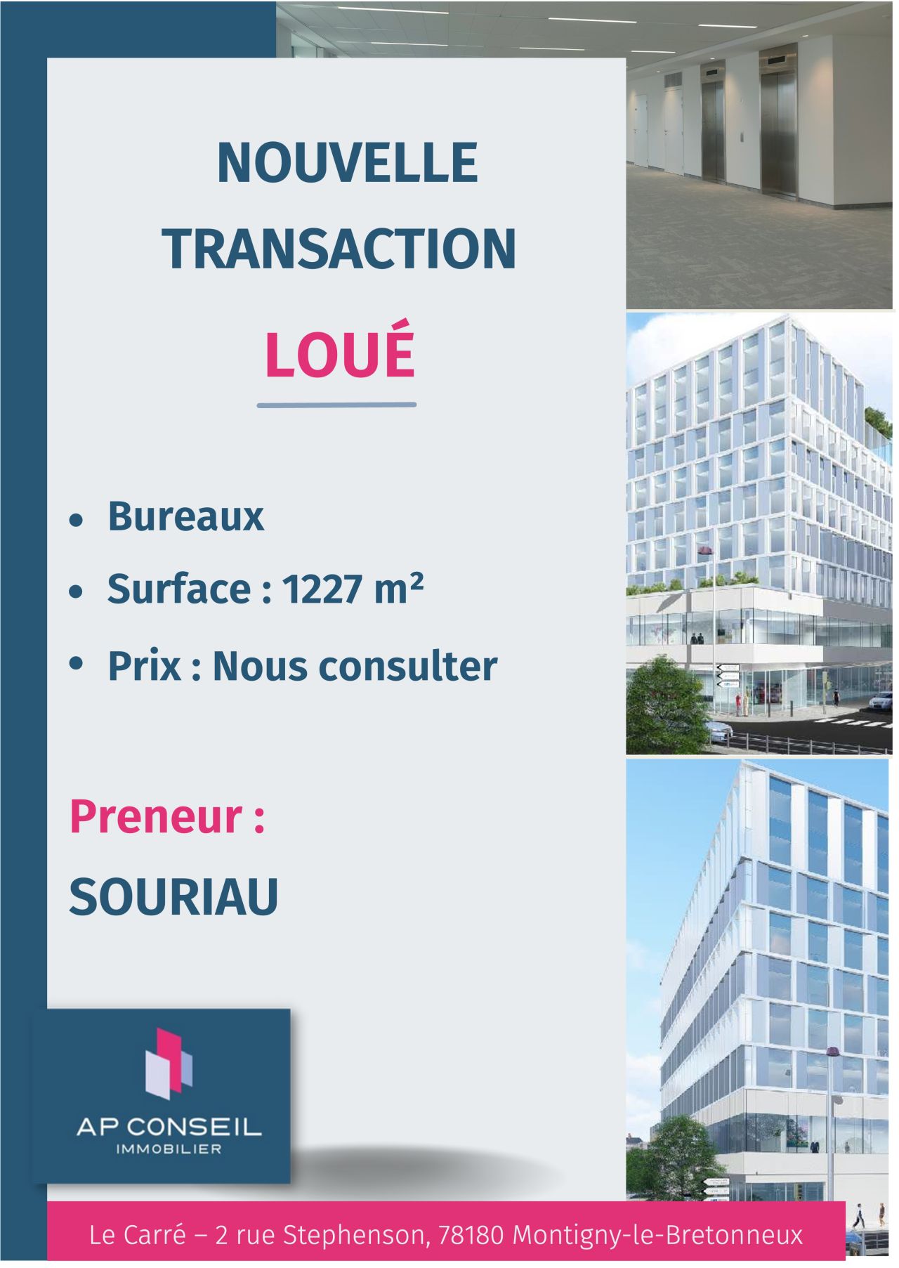 Nous avons loué des bureaux de 1227 m2 situés dans la ville de Montigny-le-Bretonneux.