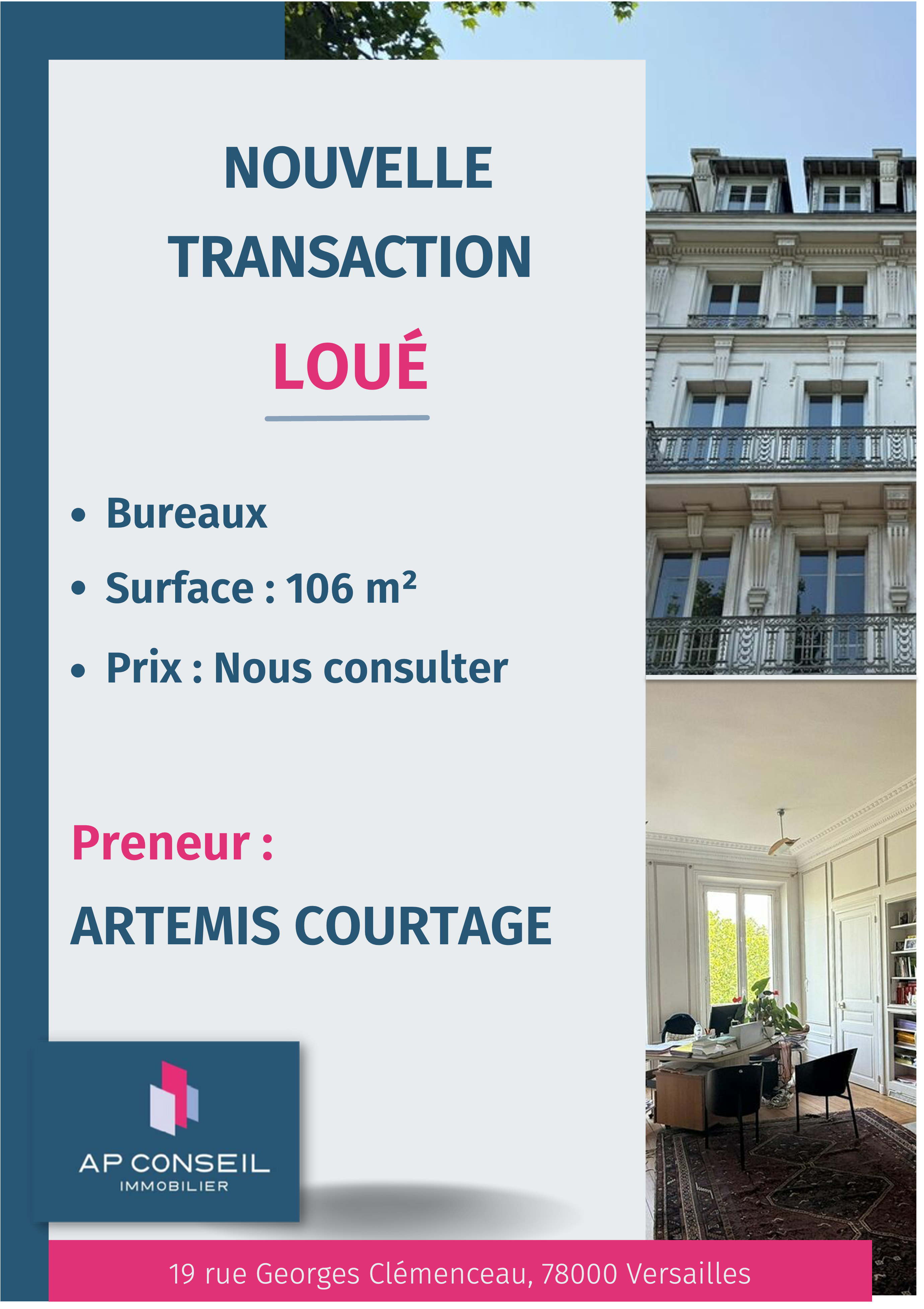 Nous avons loué des bureaux de 106 m2 situés dans la ville de Versailles.